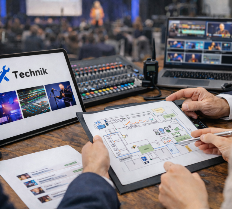 Eine professionelle technische Umsetzung ist das Fundament jedes gelungenen Events. Wir sorgen dafür, dass Licht, Ton und Medientechnik perfekt aufeinander abgestimmt sind und Ihre Veranstaltung reibungslos funktioniert. Dabei arbeiten wir mit erfahrenen Technikpartnern und modernster Ausstattung, um höchste Qualität und Zuverlässigkeit zu gewährleisten.